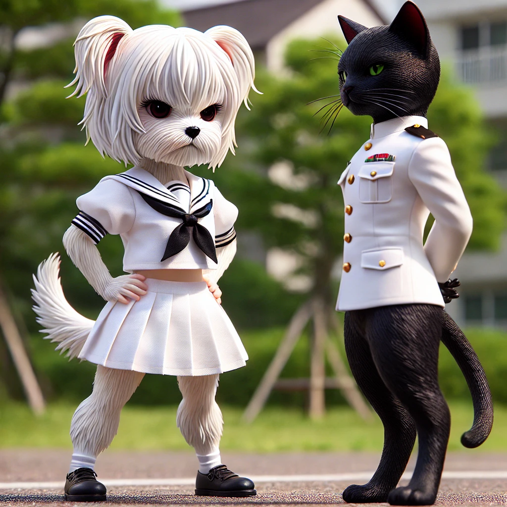 Who knew the cutest rivalry could look this serious? Our Westie schoolgirl is ready to school the sophisticated black cat officer – all in the name of charm, attitude, and a dash of mischief!