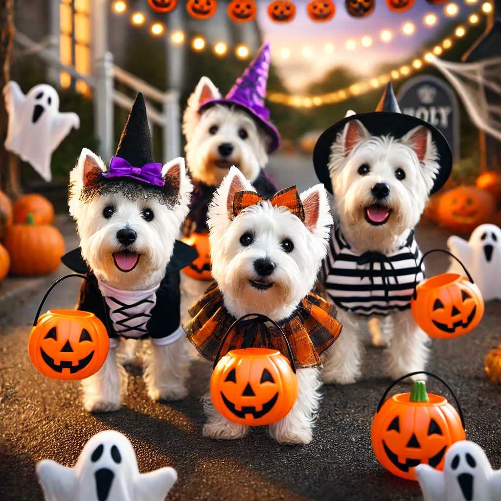 These adorable Westies are ready for trick-or-treating, carrying their pumpkin baskets with spooky excitement! 🎃🐾